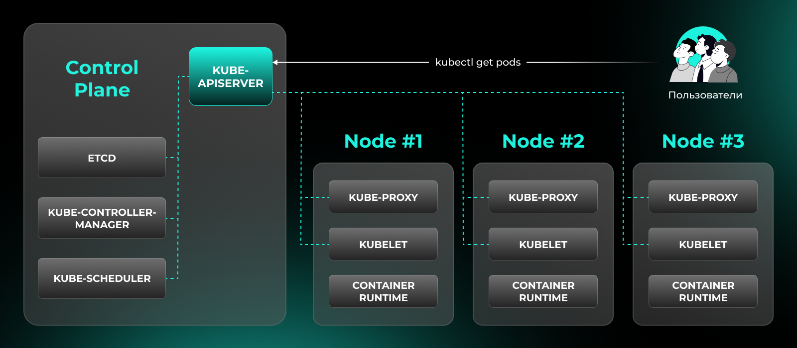 • API-сервер Kubernetes (kube-apiserver). Единая точка входа для взаимодействия с кластером. Обрабатывает все запросы, управляет состоянием объектов и обеспечивает аутентификацию и авторизацию.